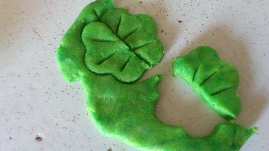 - Hamurun birazına yeşil gıda boyası katıp yoğurun. Çiçek kalıpla kesip ortalarından kesin, bıçakla bir kaç çentik atın.