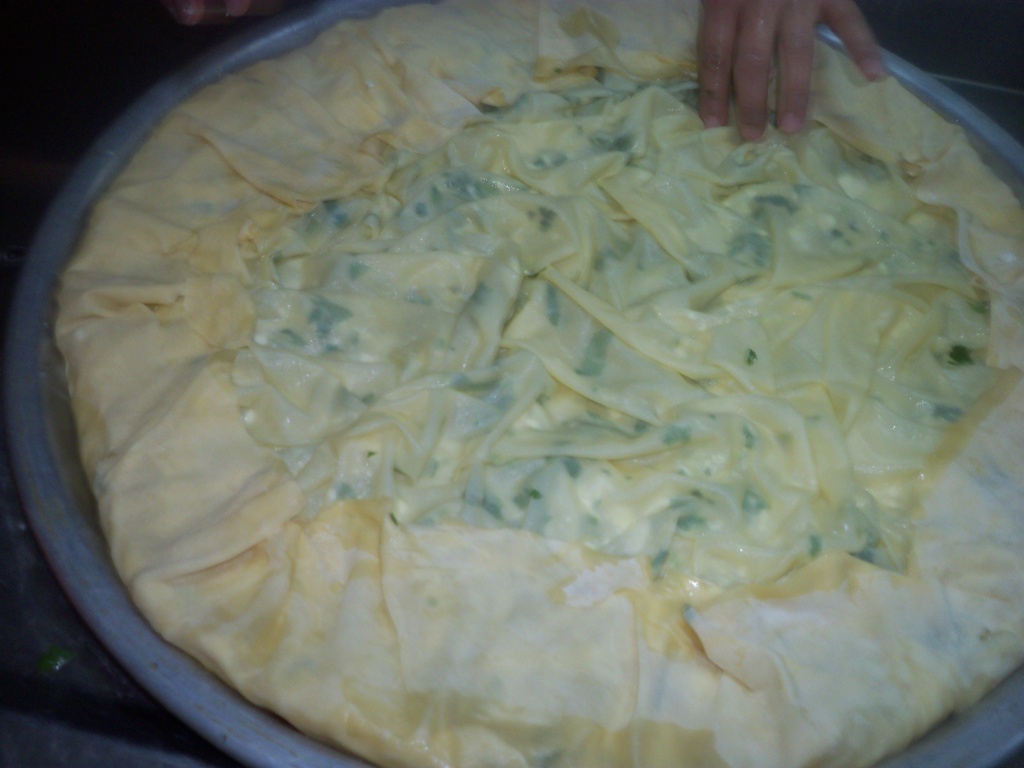• Unun ortasına yumurtalar kırılıp elle çırpılır. Süt ve su ile tuz eklenip biraz sert bir hamur yoğrulur. 12 beze yapılır. Tepsi büyüklüğünde, yufkadan biraz daha kalın açılır. En alta seriecek tepsiden 4-5 parmak daha büyük açılır. Bir sofra bezine yan yana dizilir. Tepsi yağlanır. Geniş bir tencerede bol su kaynatılır. Tencereniz yeterince büyükse kesmeden yapabilirsiniz. Biraz tuz atılır. Hamurların biri ayrılır. Diğerleri dörde bölünür. Teker teker kaynayan suya atılır. Kevgirle üstten bastırarak 1–2 dakika kaynatılır. Haşlanan hamur soğuk su dolu bir kaba atılıp hemen kevgire yayılır. Bir tepsiye kevgir ters çevrilir. Temiz bir peçete ile hamurun suyu alınıp tepsiye yayılır. Dört parça haşlanıp bir sıra olunca tavada eritilen yağdan 1–2 kaşık gezdirilir. 6 yufka bu şekilde yapılıp aralarına yağ sürülür. Bu arada suyu bir bez veya havlu peşete ile alınıp ezilen peynir ve kıyılmış maydanoz harmanlanr. (Kıymalı iç yapacaksanız yağda kıyma ve soğan kavrulup baharat ve tuzu atılır.) Hamurun üzerine yayılır. Kalan 5 yufka da kesilip haşlanarak aynı şekilde yayılır. Son yufka kesilmeden haşlanıp yayılır. Kalan yağ üzerine gezdirilip harlı ateş üzerinde önce bir tarafı, sonra başka bir tepsi ile ters çevrilerek diğer tarafı pişirilir. Sık sık çevirerek her tarafının eşit oranda pişmesi sağlanmalıdır. Asıl su böreği bu şekilde pişirilir, ama fırın daha kolayımıza geliyor fırın da da pişiriyoruz.  O zaman 200 derecedeki sıcak fırına verilir. Pişip biraz ılıyınca dilimlenerek servis yapılır.